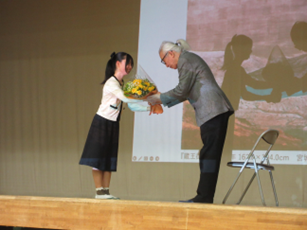 “芸術家というと、自分のセンスのままに自由に様々な表現をしているというイメージがありました。しかし、レオナルド・ダ・ヴィンチのように細部まで比率を計算して、数学的に表現する芸術家もいるということに驚きました。配布された油画の資料を見たり、佐藤会長の話を聴いて、今までは全く知らなかった油画に関する知識を得ることができました。例えば、不透明な絵具層に、透明な絵具層を重ね、下層・上層をつくる。それらが相互作用することで、油画独特の魅力が生み出されるようになっているということです。油画を見る機会は少ないですが、今回「油画のしくみ」を知ることで、次に見る機会に、視野を広げて、さらに楽しんで鑑賞できるなと思いました。芸術活動をしていく上で、「自分が百パーセント満足できるような作品を生み出すということは難しいことなんだ。」と感じました。しかし、満足できないからこそ、さらに自分の作品を見つめて、よりよいものを作るように追求して行くことが創作活動の素晴らしさであると気づくことができました。私も佐藤会長のように自分の得意とすることや好きなことを大切にして、これから3年間の高校生活、そして未来の人生においてとことん突き詰めることができるように頑張りたいです。”